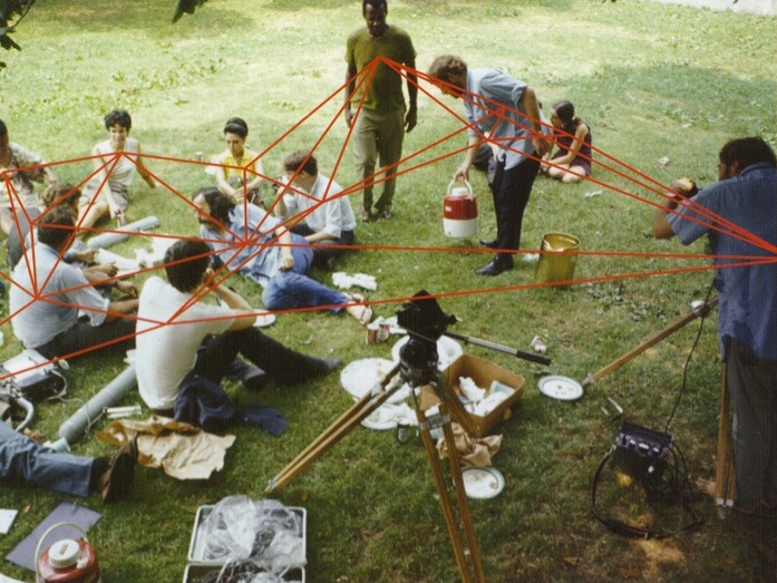 In Félix Guattari’s book The Three Ecologies (2000), three different ecologies become the arenas of the happening: the self, the socius, and the environment, with each ecology fluidly asserting control over the other. One thinks of Michel Serres’s “quasi-object” which devours its objecthood almost entirely in order to be able to circulate faster: an impulse of the fiery ball being thrown between the players, metamorphosing through every kick. The impulse acts as “a subject of circulation, the players are only the stations and relays.” 6 Each station this ball passes through will be changed by its passage, becoming the collective, and, if it stops, becoming the individual.