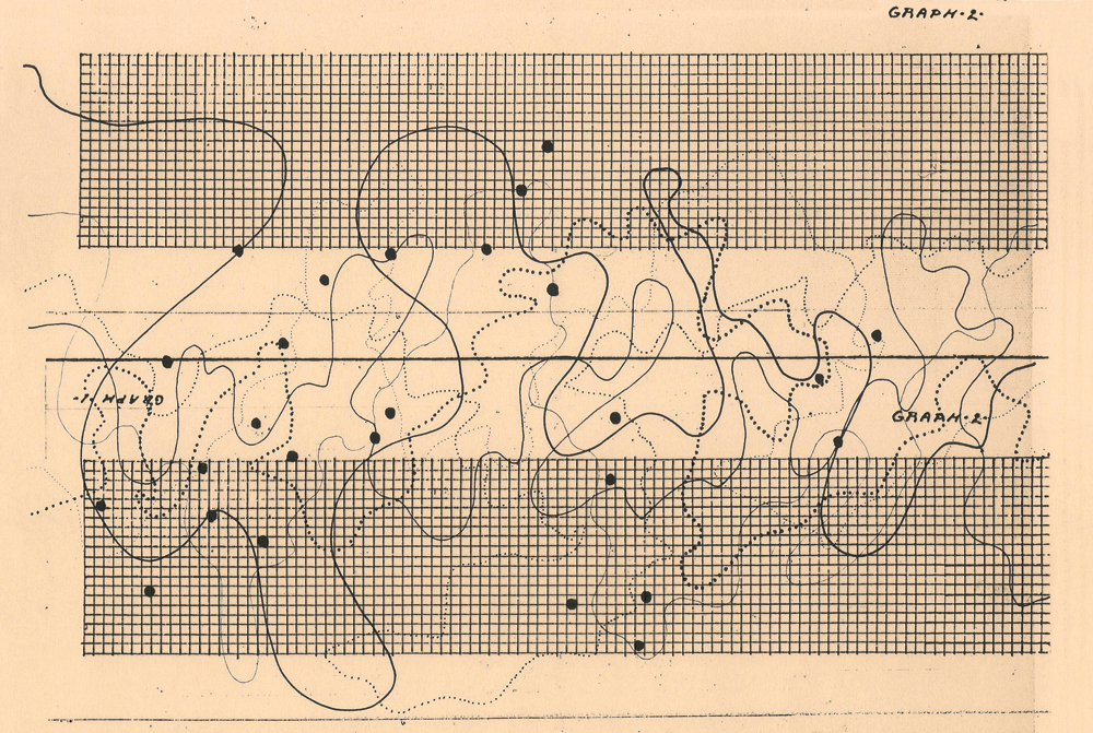 Alvin Lucier, Graphic Score for Music for the Solo Performer. Image courtesy of Alvin Lucier, 1965. “Sitting on a chair, eyes closed, Lucier’s brainwaves were recorded from his scalp, amplified and channelled to numerous loudspeakers scattered around the room. […] the loudspeakers were put ‘right up against’ various percussion instruments, which were then activated by means of vibration.” D. Kahn, in Earth Sound Earth Signal: Energies and Earth Magnitude in the Arts (Oakland, CA: University of California Press, 2013).